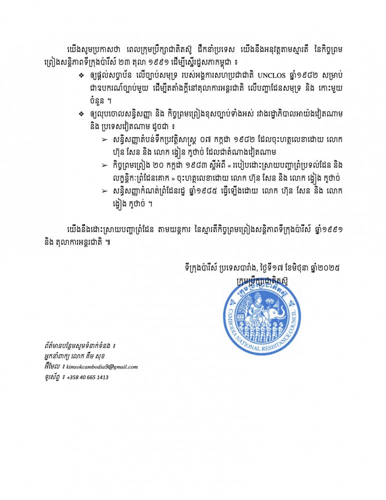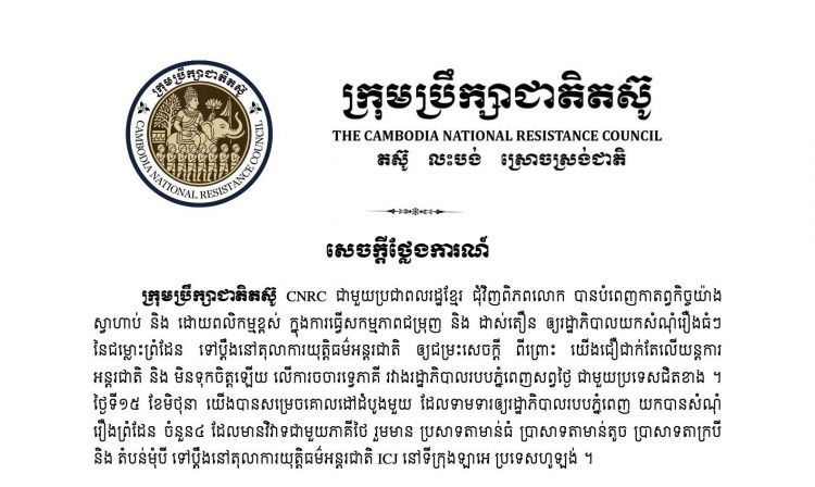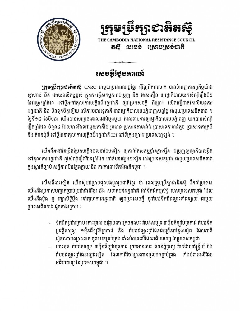 សេចក្តីថ្លែងការណ៍ក្រុមប្រឹក្សាជាតិតស៊ូ (CNRC) ជុំវិញការធ្វើសកម្មភាពជំរុញ និង ដាស់តឿនឲ្យរដ្ឋាភិបាលកម្ពុជាយកសំណុំរឿងធំៗ នៃជម្លោះព្រំដែន ទៅប្តឹងនៅតុលាការយុត្តិធម៌អន្តរជាតិ (ICJ)