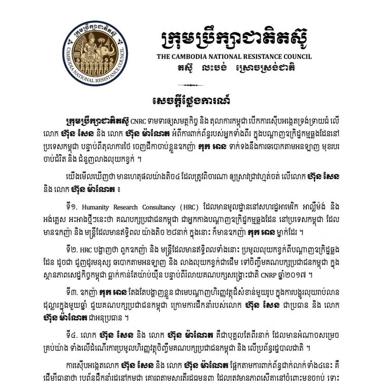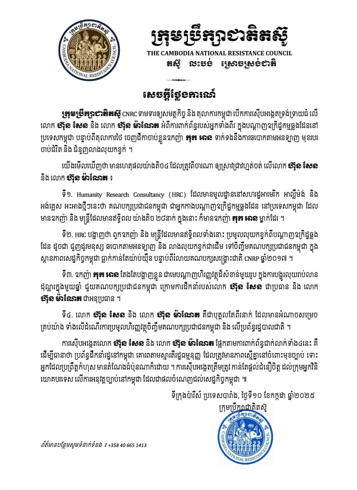 សេចក្តីថ្លែងការណ៍ ក្រុមប្រឹក្សាជាតិតស៊ូ ថ្ងៃទី១០ ខែកក្កដា ឆ្នាំ២០២៥