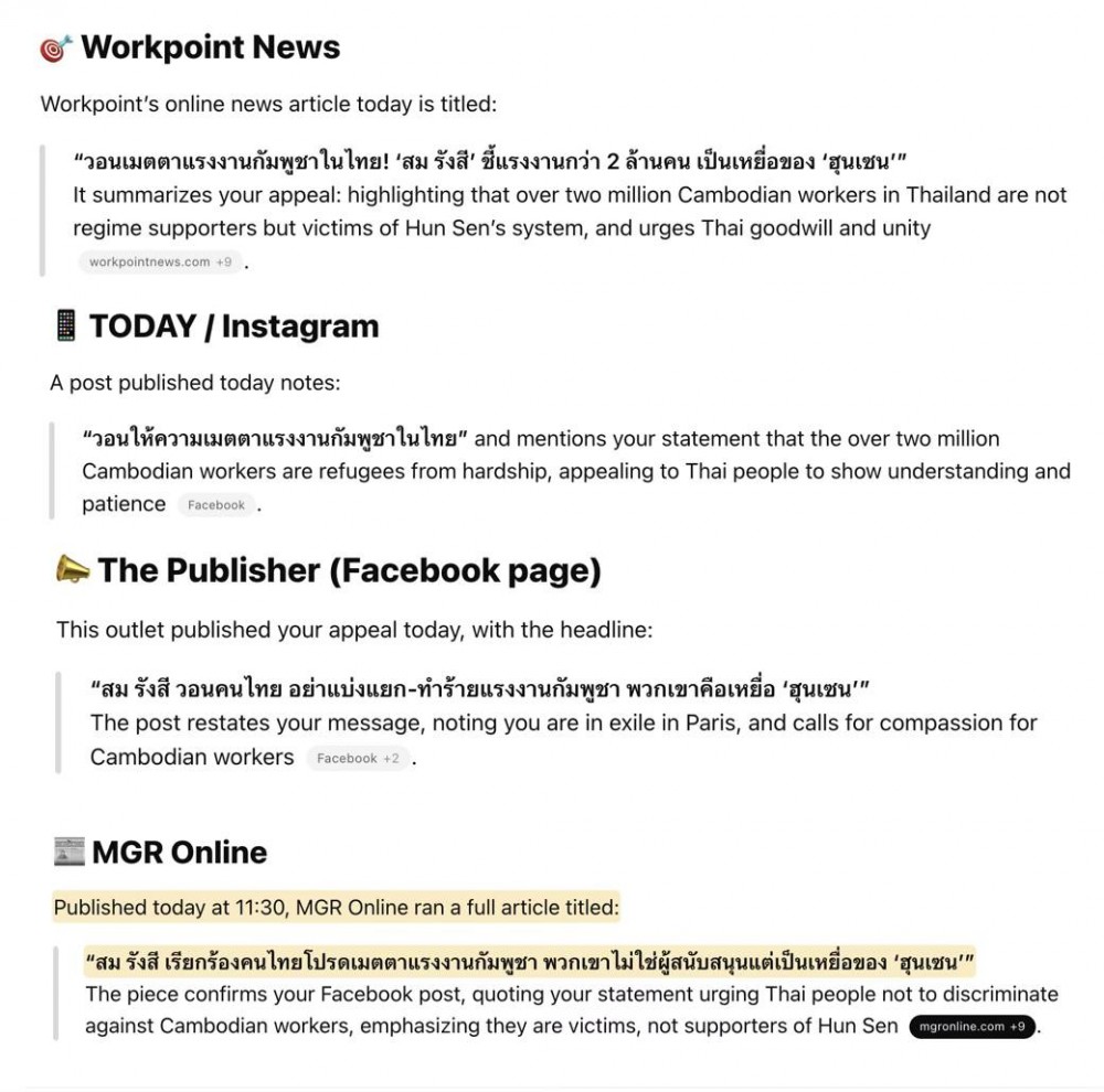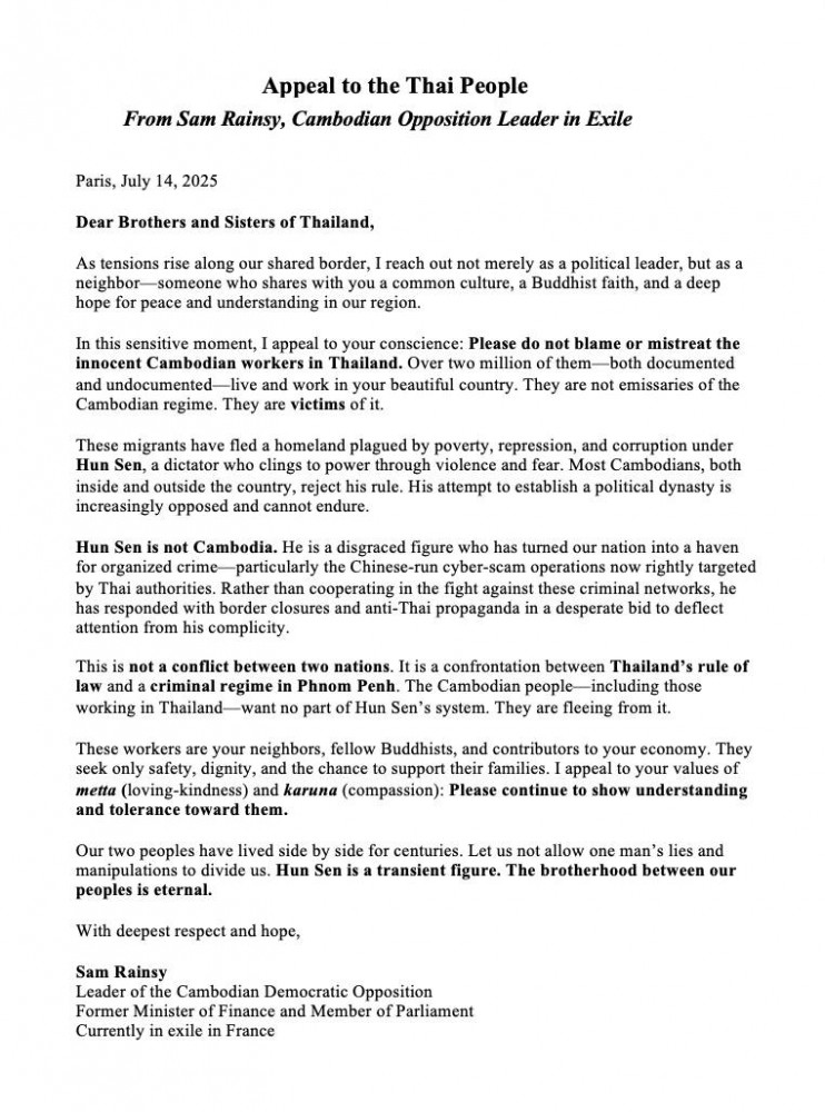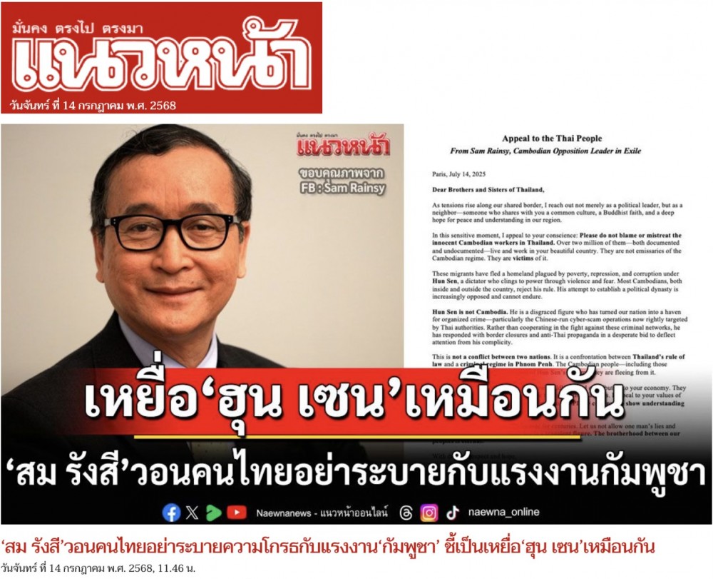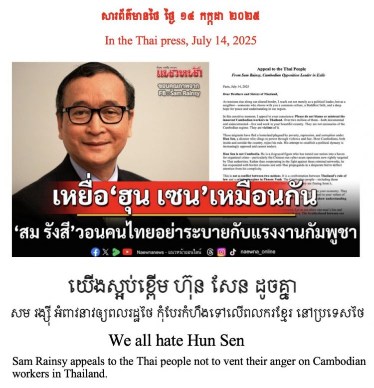 ថ្ងៃ ១៤ កក្កដា ២០២៥ នេះ សារព័ត៌មាន នៅប្រទេសថៃ បានចុះផ្សាយយ៉ាងទូលំទូលាយ សេចក្តីអំពាវនាវរបស់លោក សម រង្ស៊ី ជូនចំពោះប្រជាពលរដ្ឋថៃ សូមកុំឲ្យរើសអើង និងធ្វើបាបពលករខ្មែរ នៅប្រទេសថៃ ពីព្រោះជនជាតិខ្មែរទាំងនោះ មិនមែនជាអ្នកគាំទ្រ ហ៊ុន សែន ទេ តែជាអ្នករងគ្រោះពីរបបផ្តាច់ការ និងពុករលួយ ដឹកនាំដោយត្រកូល ហ៊ុន សែន។ របបនេះ ចេះតែបំផ្លាញជាតិ និងធ្វើបាបរាស្ត្រខ្លួនឯង។