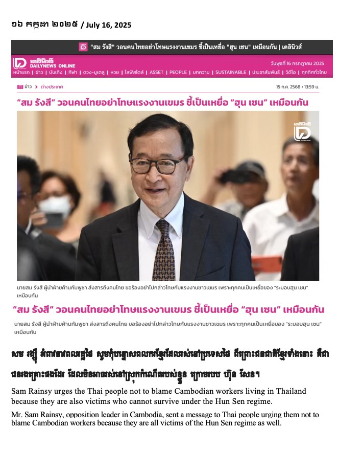 សម រង្ស៊ី អំពាវនាវពលរដ្ឋថៃ សូមកុំបន្ទោសពលករខ្មែរដែលរស់នៅប្រទេសថៃ ពីព្រោះជនជាតិខ្មែរទាំងនោះ គឺជាជនរងគ្រោះផងដែរ ដែលមិនអាចរស់នៅស្រុកកំណើតរបស់ខ្លួន ក្រោមរបប ហ៊ុន សែន។