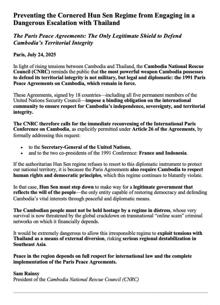 In light of rising tensions between Cambodia and Thailand, the Cambodia National Rescue Council (CNRC) reminds the public that the most powerful weapon Cambodia possesses to defend its territorial integrity is not military, but legal and diplomatic: the 1991 Paris Peace Agreements on Cambodia, which remain in force.