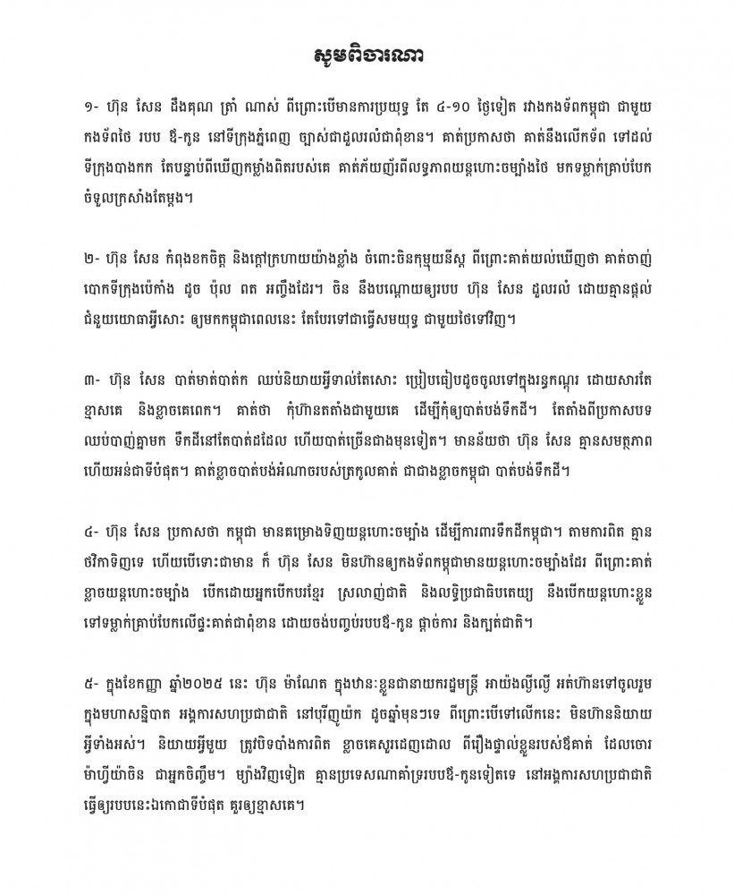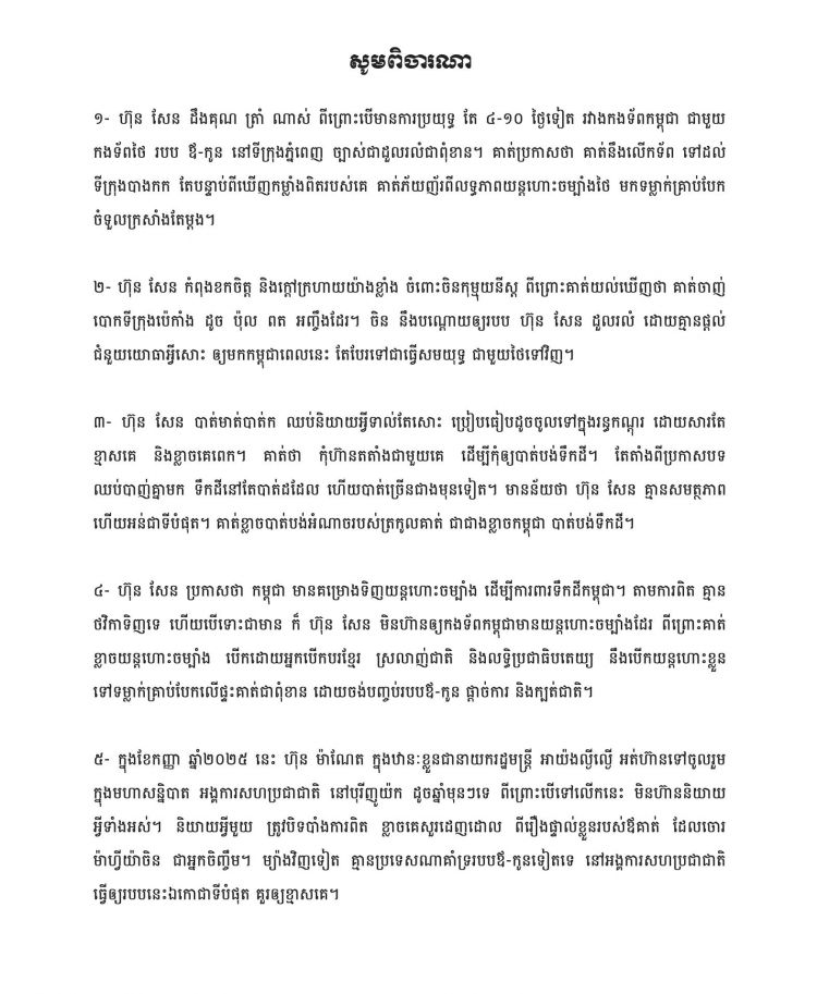 4- Hun Sen announced that Cambodia plans to purchase fighter jets to defend its territory. In reality, there is no budget for such a purchase. Even if there were, Hun Sen would never dare allow the Cambodian army to possess fighter jets, because he fears that patriotic and pro-democracy Cambodian pilots might use them to bomb his own residence — to end the dictatorial and traitorous father-and-son regime once and for all.
