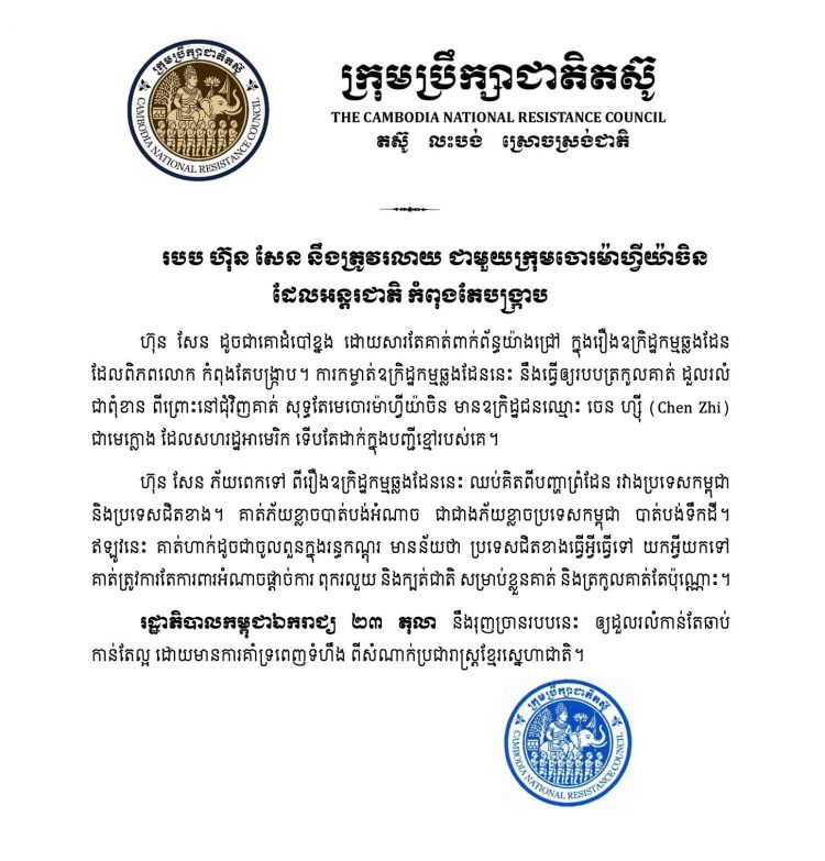 ហ៊ុន សែន ដូចជាគោដំបៅខ្នង ដោយសារតែគាត់ពាក់ព័ន្ធយ៉ាងជ្រៅ ក្នុងរឿងឧក្រិដ្ឋកម្មឆ្លងដែន ដែលពិភពលោក កំពុងតែបង្ក្រាប។ ការកម្ចាត់ឧក្រិដ្ឋកម្មឆ្លងដែននេះ នឹងធ្វើឲ្យរបបត្រកូលគាត់ ដួលរលំជាពុំខាន ពីព្រោះនៅជុំវិញគាត់ សុទ្ធតែមេចោរម៉ាហ្វីយ៉ាចិន មានឧក្រិដ្ឋជនឈ្មោះ ជេន ហ្ស៊ី (Chen Zhi) ជាមេក្លោង ដែលសហរដ្ឋអាមេរិក ទើបតែដាក់ក្នុងបញ្ជីខ្មៅរបស់គេ។ ហ៊ុន សែន ភ័យពេកទៅ ពីរឿងឧក្រិដ្ឋកម្មឆ្លងដែននេះ ឈប់គិតពីបញ្ហាព្រំដែន រវាងប្រទេសកម្ពុជា និងប្រទេសជិតខាង។ គាត់ភ័យខ្លាចបាត់បង់អំណាច ជាជាងភ័យខ្លាចប្រទេសកម្ពុជា បាត់បង់ទឹកដី។ ឥឡូវនេះ គាត់ហាក់ដូចជាចូលពួនក្នុងរន្ធកណ្តុរ មានន័យថា ប្រទេសជិតខាងធ្វើអ្វីធ្វើទៅ យកអ្វីយកទៅ គាត់ត្រូវការតែការពារអំណាចផ្តាច់ការ ពុករលួយ និងក្បត់ជាតិ សម្រាប់ខ្លួនគាត់ និងត្រកូលគាត់តែប៉ុណ្ណោះ។ រដ្ឋាភិបាលកម្ពុជាឯករាជ្យ ២៣ តុលា នឹងរុញច្រានរបបនេះ ឲ្យដួលរលំកាន់តែឆាប់ កាន់តែល្អ ដោយមានការគាំទ្រពេញទំហឹង ពីសំណាក់ប្រជារាស្ត្រខ្មែរស្នេហាជាតិ។