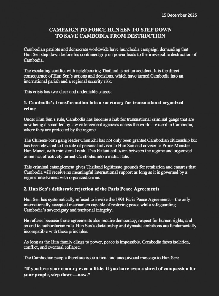 Cambodian patriots and democrats worldwide have launched a campaign demanding that Hun Sen step down before his continued grip on power leads to the irreversible destruction of Cambodia.