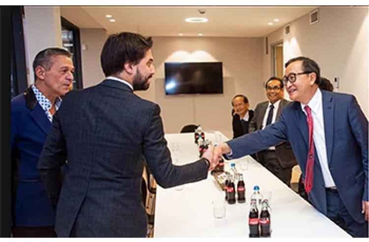 Sam Rainsy shaking hands with Georges-Louis Bouchez, President of the Reformist Movement (Mouvement Réformateur), which is leading a coalition government in Belgium.
