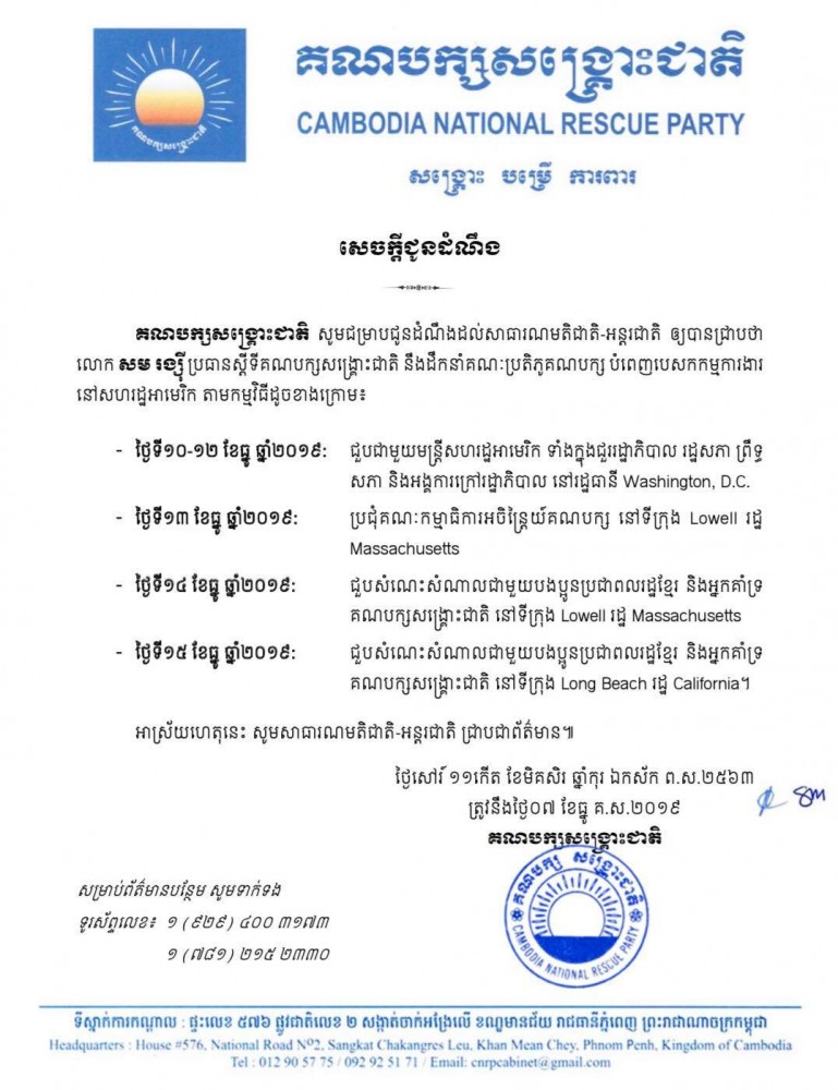 A Cnrp delegation led by acting president Sam Rainsy will visit USA from December 10th to 15th. Meetings are scheduled with USA government, congress and NGO’s in Washington DC on 10-12th, Cnrp Executive Committee in Lowell on 13th, with Cambodian communities in Lowell, Massachusetts on 14th and in Long Beach, California on 15th.