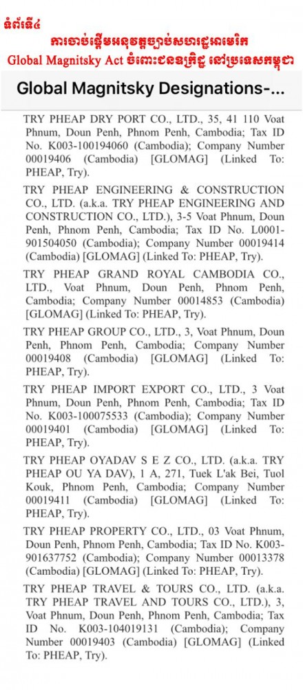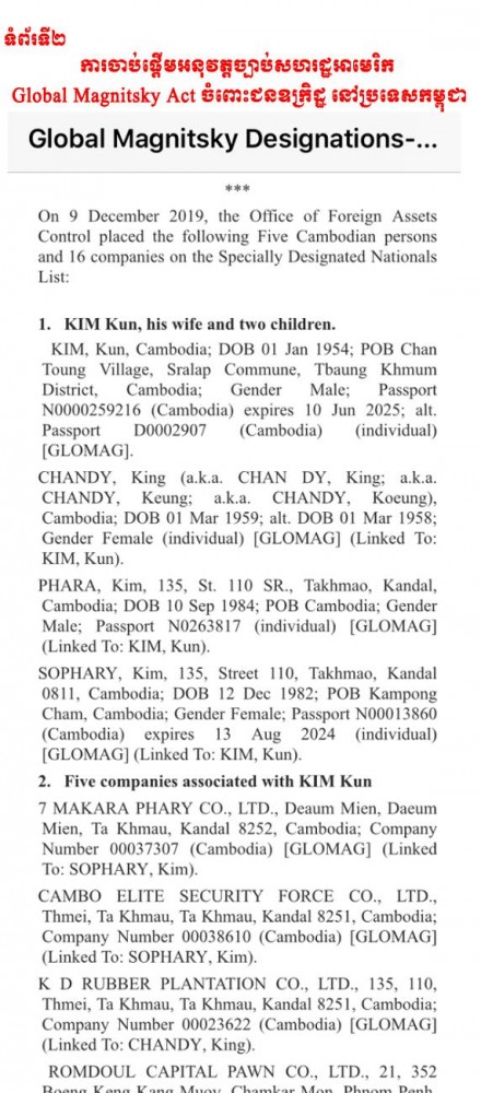 យើងទើបតែបានទទួលដំណឹង ថ្ងៃនេះ ថា បក្ខពួក ហ៊ុន សែន ក្នុងនោះមាន គន់ គីម, ទ្រី ភាព និងក្រុមគ្រួសារ ចាប់ផ្តើមទទួលទណ្ឌកម្ម យោងច្បាប់ សហរដ្ឋអាមេរិក Global Magnitsky Act ដែលដាក់ទណ្ឌកម្មលើជនឧក្រិដ្ឋទូទាំងពិភពលោក។ ជនឧក្រិដ្ឋទាំងនោះនឹងត្រូវគេបង្កក ឬរឹបអូស ទ្រព្យសម្បត្តិ នៅសហរដ្ឋអាមេរិក។ ការដាក់ទណ្ឌកម្មនេះ ក៏មានន័យផងដែរថា បុគ្គលដែលបានប្រព្រឹត្តបទឧក្រិដ្ឋ មិនអាចមកជាន់ដីសហរដ្ឋអាមេរិកបានទៀតទេ ដោយសារគេផ្អាកផ្តល់ទិដ្ឋការ។