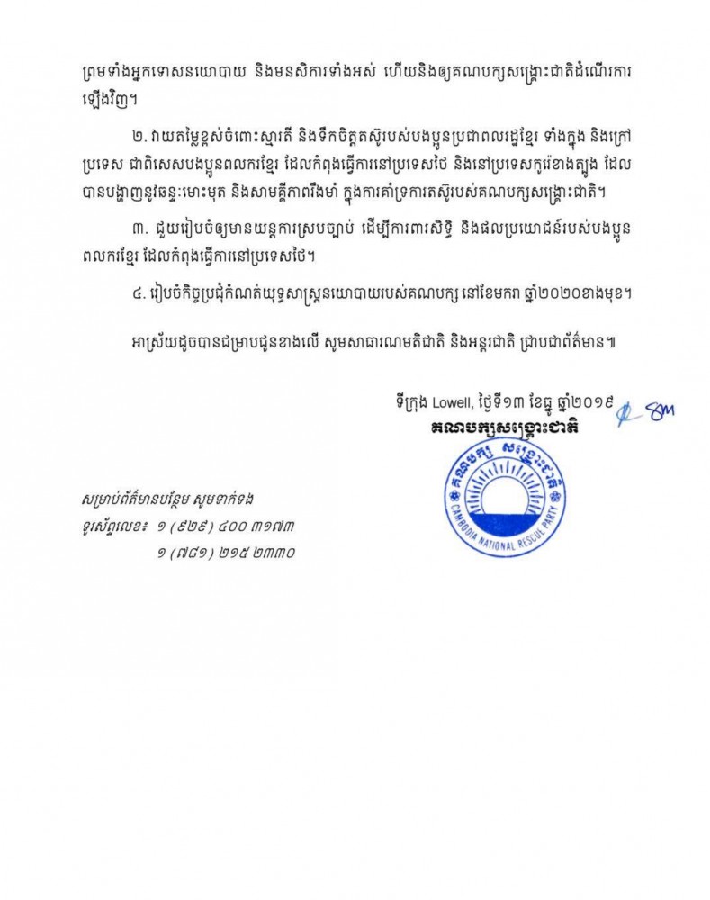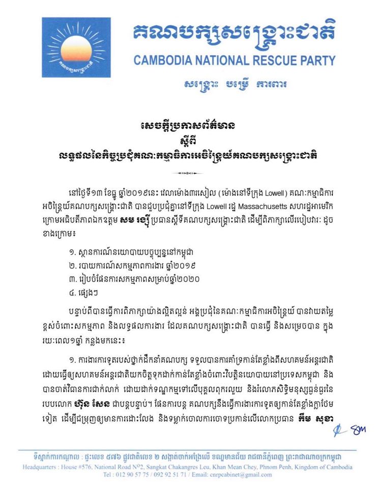 សេចក្តីប្រកាសព័ត៌មាន ស្តីពី លទ្ធផលនៃកិច្ចប្រជុំគណៈកម្មាធិការអចិន្ត្រៃយ៍គណបក្សសង្គ្រោះជាតិ នៅទីក្រុង Lowell រដ្ឋ Massachusetts សហរដ្ឋអាមេរិក ថ្ងៃទី១៣ ខែធ្នូ ឆ្នាំ២០១៩ / Press release on the result of the CNRP Permanent Committee meeting in Lowell, Massachusetts on December 13, 2019